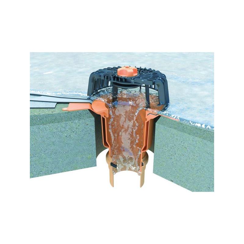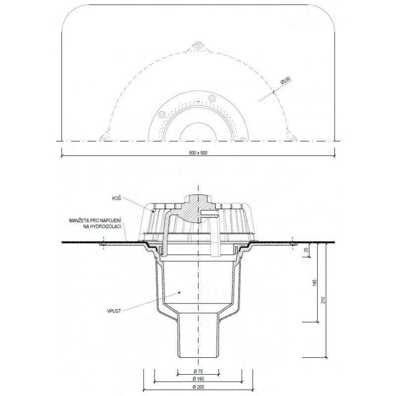 Strešná vpusť priama (zvislá) s bitúmenovou manžetou (modifikovaný asfaltový pás). Používa sa na odvodnenie plochých striech, terás a balkónov. Súčasťou balenia je ochranný kôš. Telo vpusti a ochranného koša je vyrobené z polyamidu PA6. Vpusť je tepelne izolovaná – dvojstenná.